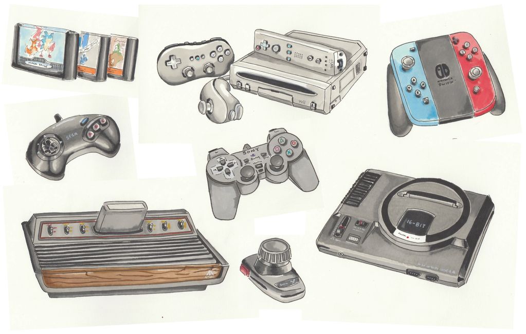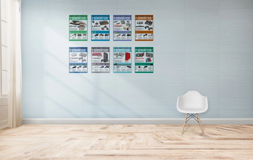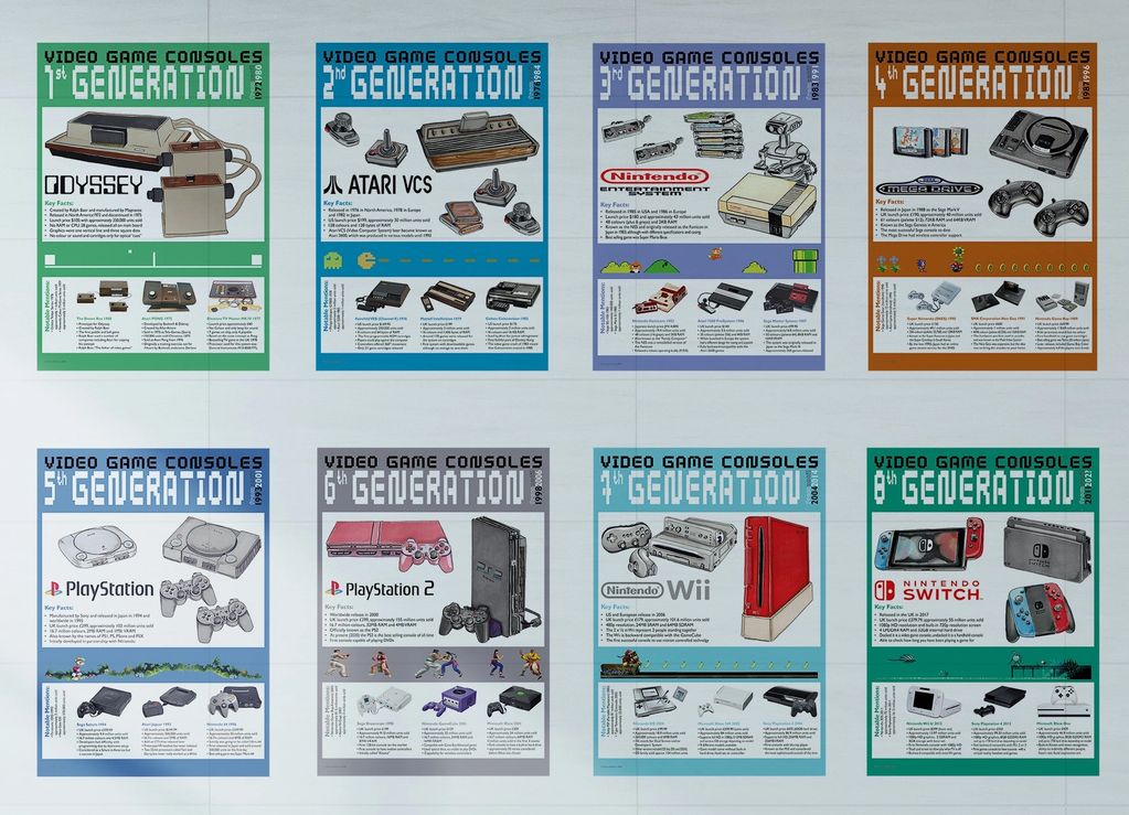 Set of 8 posters designed to show the progression of video game consoles throughout the decades.
